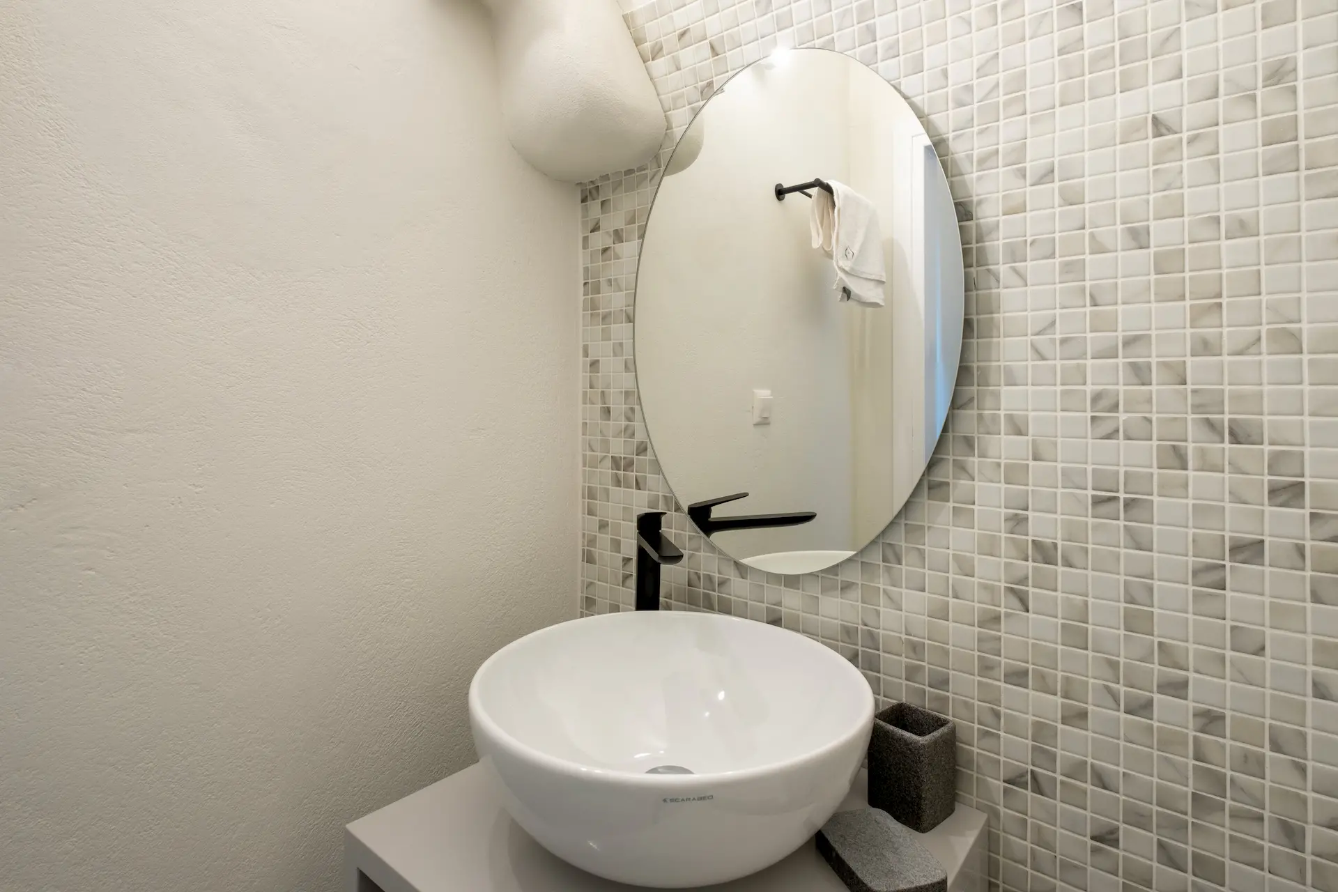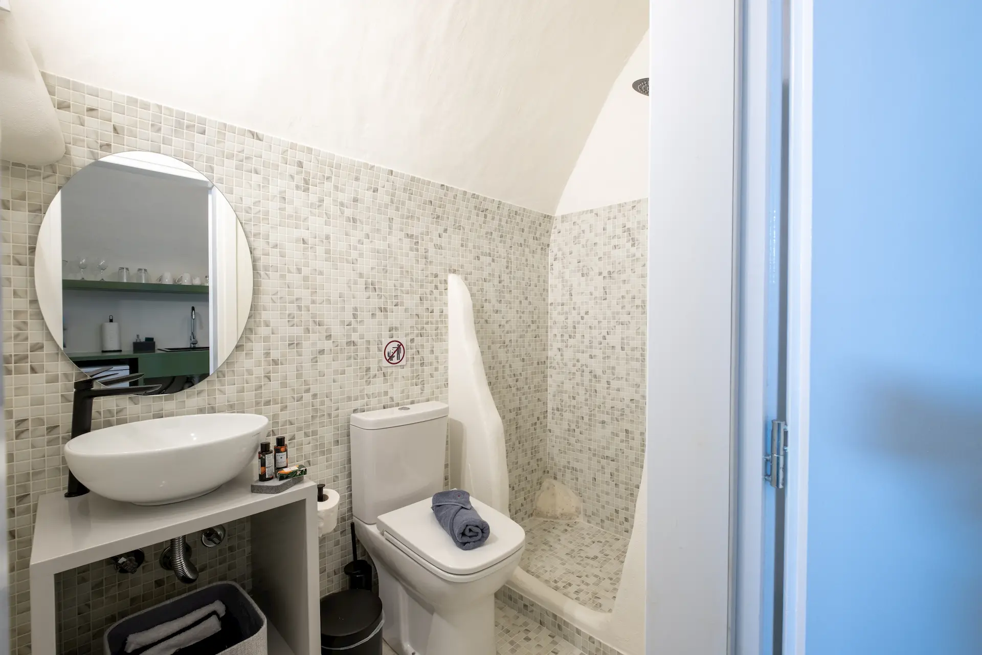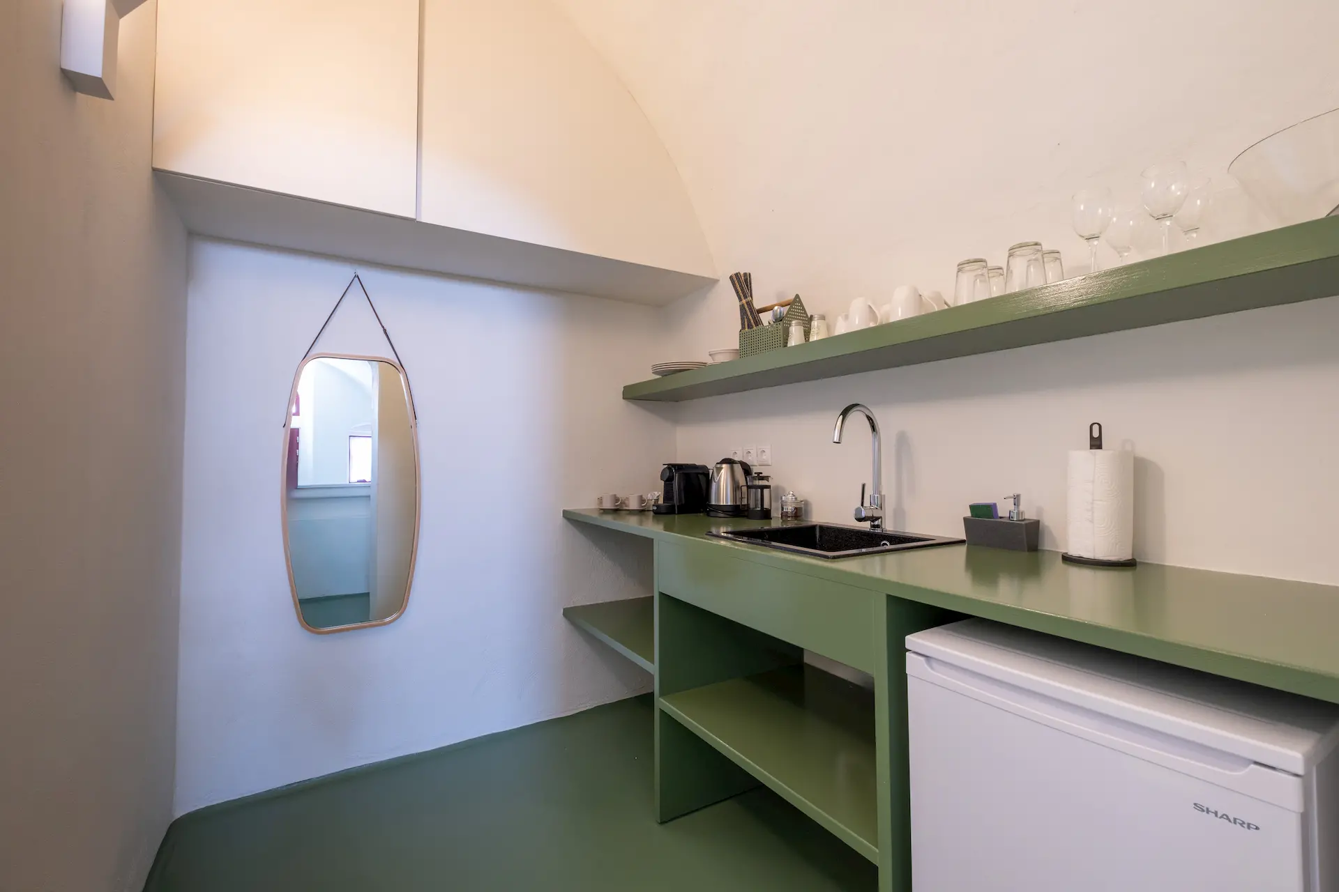 Το στούντιο έχει άμεση πρόσβαση σε εσωτερική βεράντα και οι επισκέπτες μπορούν να επωφεληθούν από την αυλή της οροφής με την εκπληκτική θέα στο μυστικιστικό ηλιοβασίλεμα της Σαντορίνης. Στους επισκέπτες μας, διατίθενται προϊόντα καλωσορίσματος, δωρεάν προϊόντα περιποίησης καθώς και μπουρνούζια.