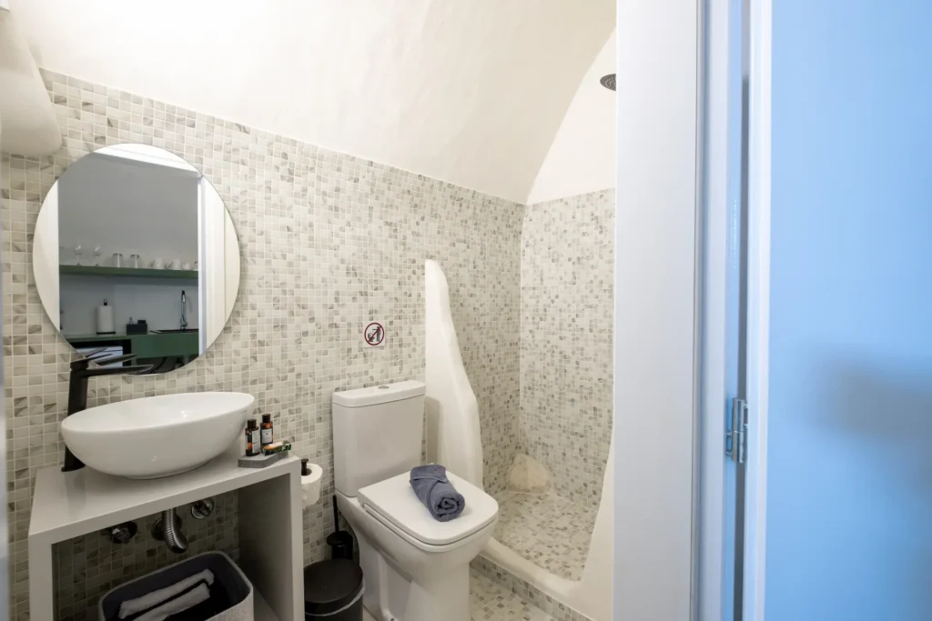 The studio also includes a modern bathroom with a rain shower, as well as a fully equipped kitchenette. Additionally, guests will have direct access to a terrace and a rooftop area with a breathtaking sunset view. On the terrace, you can relax and enjoy the scenery while taking a dip in the private pool tub, which comfortably accommodates up to four people.