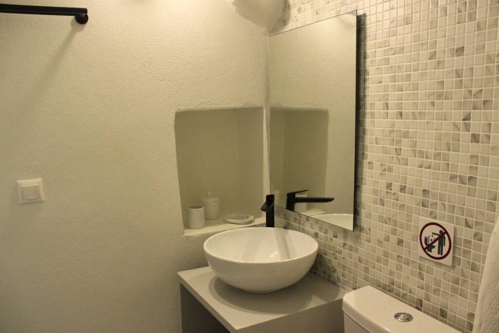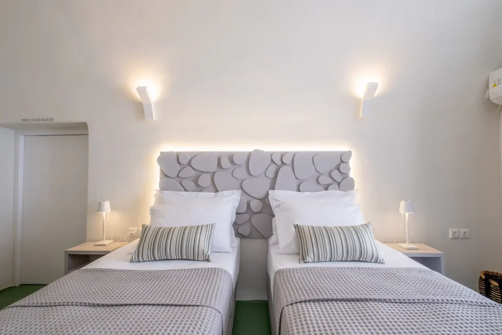 KRIMIDI cave studio is a deluxe double studio covering an area of 22 sqm. It features a cosy bedroom for two, a deluxe separate bathroom with a rain shower and a kitchen equipped with espresso and American coffee machine , kettle and mini-frigo.