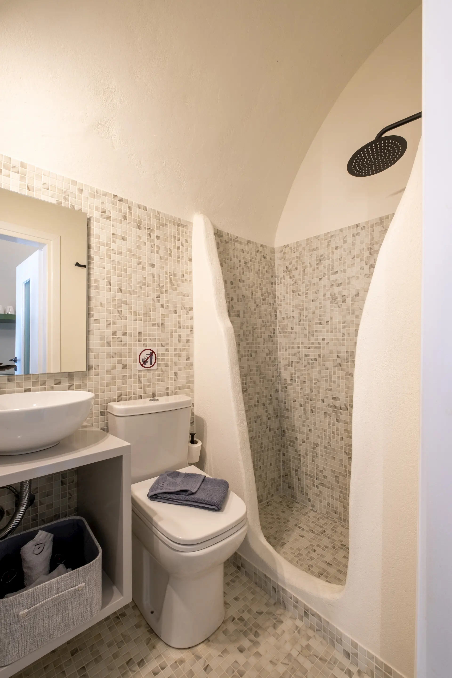 KRIMIDI cave studio is a deluxe double studio covering an area of 22 sqm. It features a cosy bedroom for two, a deluxe separate bathroom with a rain shower and a kitchen equipped with espresso and American coffee machine , kettle and mini-frigo.
